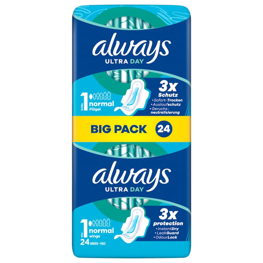 Gib dich nicht mit weniger als dem 3-fachen Schutz der Always Ultra Day Normal (Größe 1) Damenbinden zufrieden. Die Binden mit saugfähiger und weicher Oberfläche absorbieren Blut dank der InstantDry-Technologie in Sekundenschnelle. Die LeakGuard- und OdourLock-Technologien verhindern das Auslaufen von Flüssigkeit und neutralisieren Gerüche. Ihre einzigartigen ComfortLock-Flügel passen sich jeder Art von Unterwäsche an. Für zusätzlichen Schutz in der Nacht empfehlen wir die Always Ultra Nacht Größen. Always Ultra Binden sind von der Skin Health Alliance dermatologisch bestätigt.