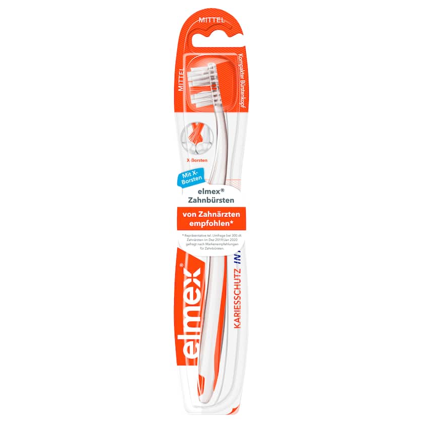 Die elmex Kariesschutz Inter X Zahnbürste mit X-Borsten zur gründlichen Reinigung bis in die Zahnzwischenräume. Höher stehende X-Borsten für die gründliche Reinigung bis in die Zahnzwischenräume. Kleiner Bürstenkopf für die Reinigung der schwer erreichbaren Backenzähne. Ergonomisch geformter Griff. In Zusammenarbeit mit Experten entwickelt. Wissenschaftlich getestet. Ein Qualitätsprodukt der elmex Forschung.