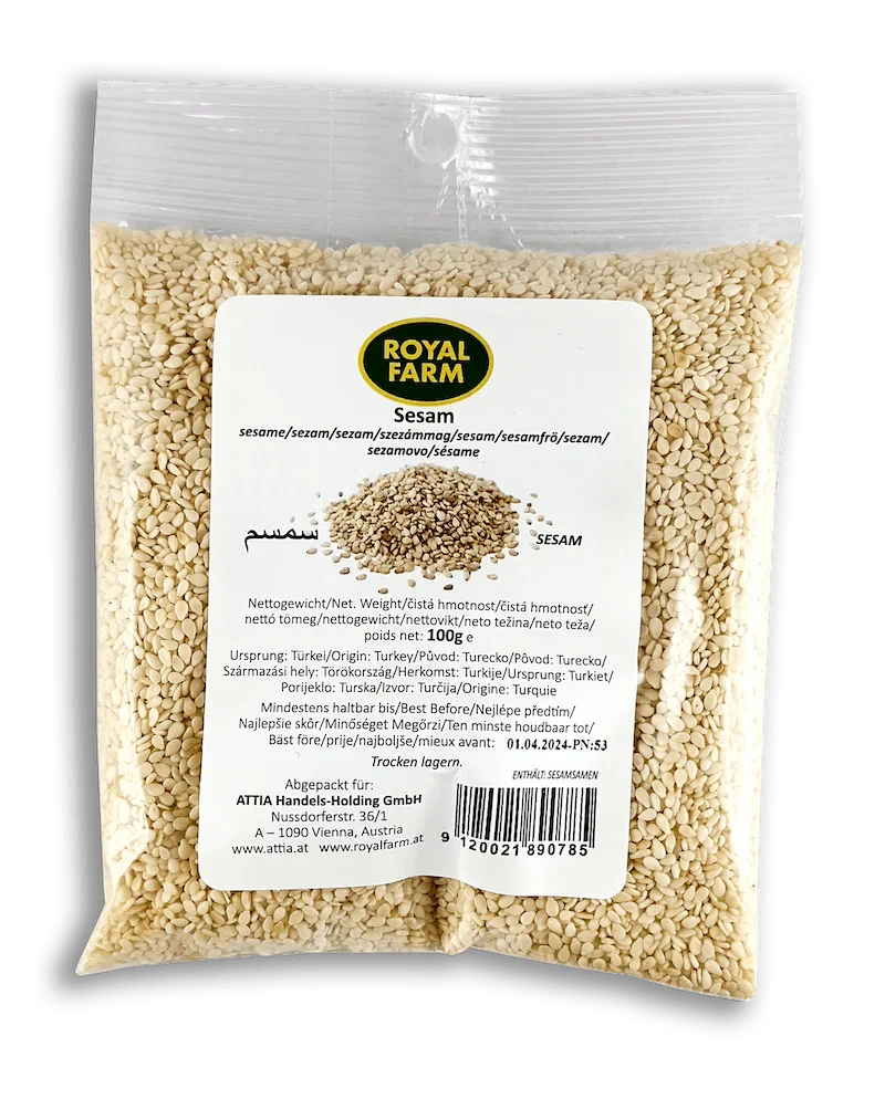 Die geschälten weißen Sesamsamen von Royal Farm sind ein Muss für alle, die gerne einfach kochen. Diese weichen, weißen Samen, importiert aus der Türkei, verleihen Brot, Salaten und Desserts ein feines Aroma und eine besondere Textur und eignen sich daher ideal für alltägliche Rezepte.